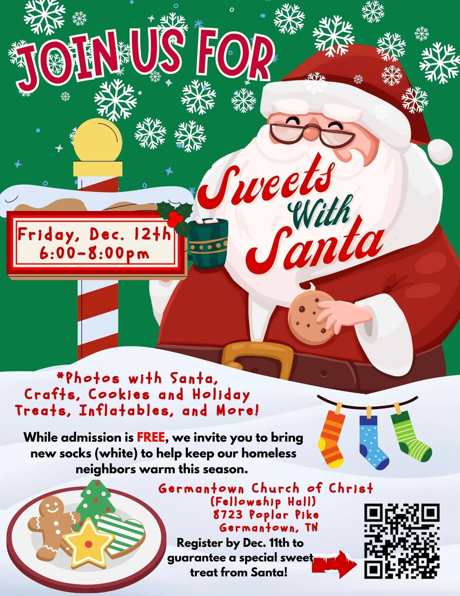 Join us in the Fellowship Hall for a free event. Enjoy photos with Santa, crafts, holiday treats, inflatables, and more. Register by December 11 to guarantee a special sweet treat from Santa. While admission is free, we’re asking everyone to bring new white socks to help our homeless neighbors stay warm this season.